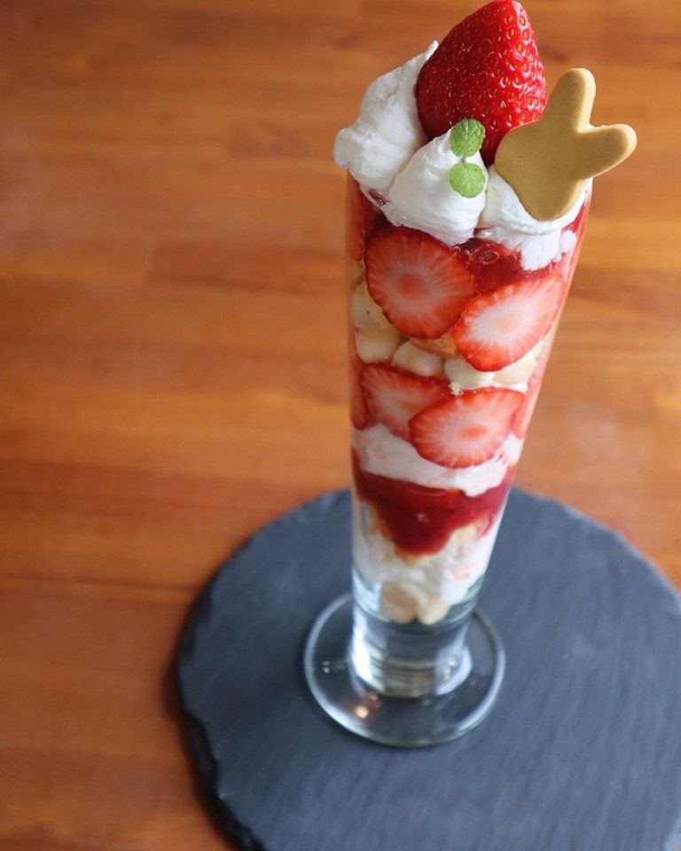 イチゴ、生クリーム、スポンジ、ヨーグルト寒天、自家製いちごジャム、純国産ボーロから成る6層仕立ての「自然派いちごパフェ」。 パフェのスポンジも、国産小麦粉を使って一から焼くこだわり。ヨーグルト寒天は生乳100%のものを使っているので酸味は控えめ。寒天独特のしっかりとした食感。 パフェにボーロは意外な組み合わせですが、サクッとしたアクセントとして、これには欠かせない存在です。背が高くて大きなパフェも、あまりのおいしさにぺろりと完食できますよ♪