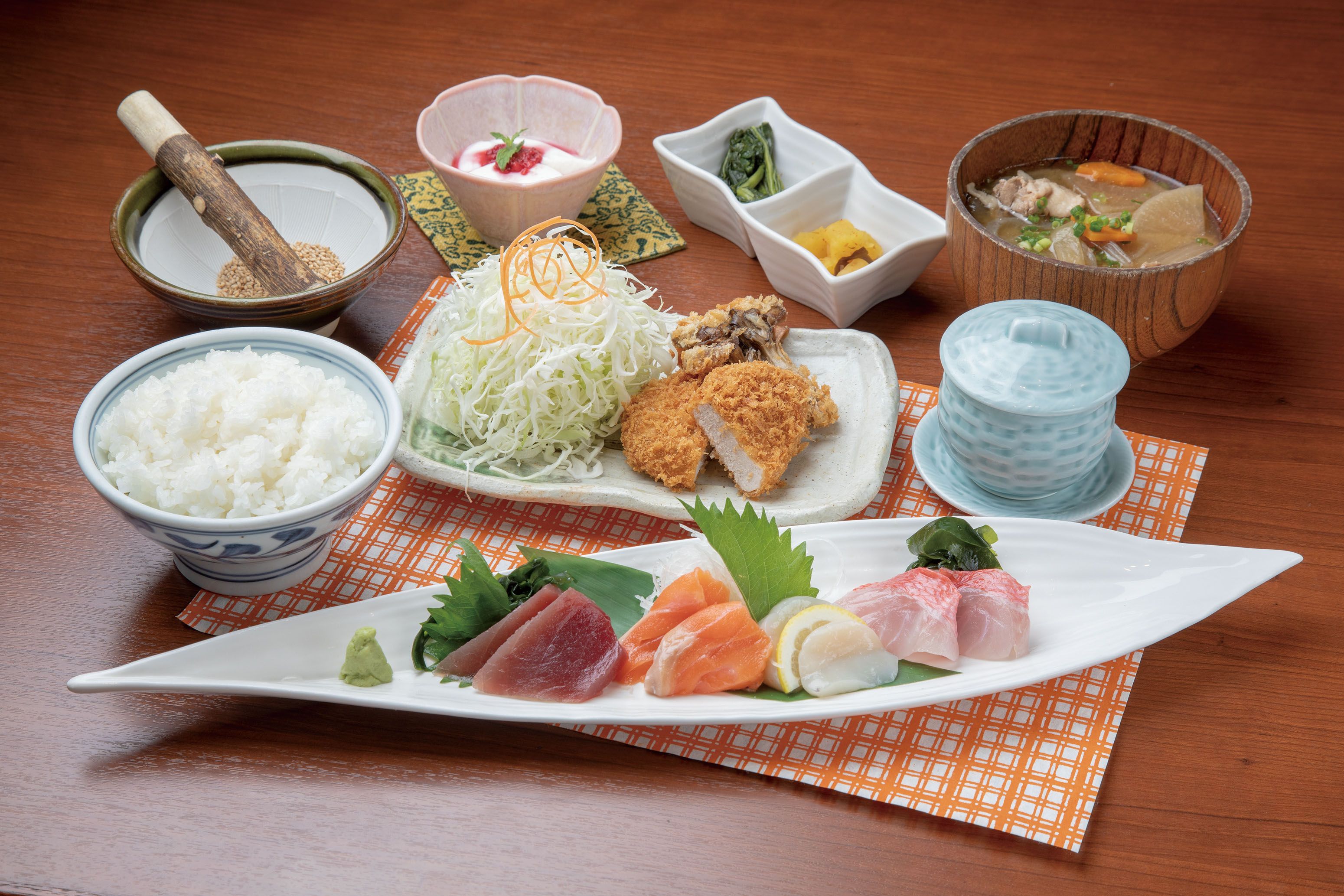 ほっと一息つける、ディナータイムにオススメのお得なセット!ロースかつとお刺身、どちらも楽しんでいただけます。刺し盛のついたお膳メニューは3種ご用意。ほかにもお酒と一緒に楽しめる逸品メニューをご用意しました。仕事帰りのちょっと一杯に、気軽にお立ち寄り下さい。宴会に最適なメニューもご用意しています♪